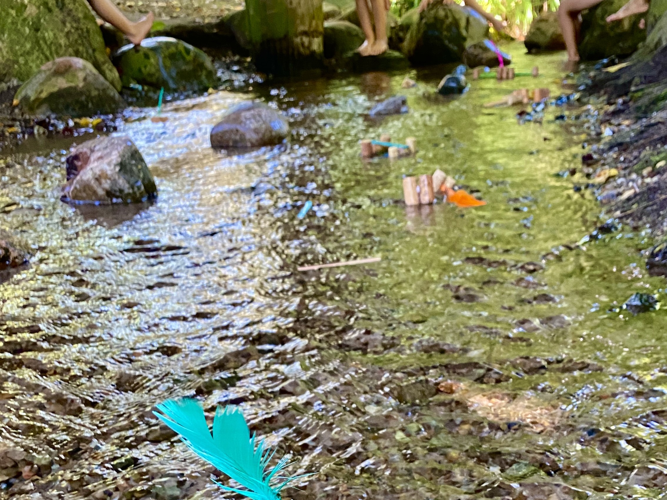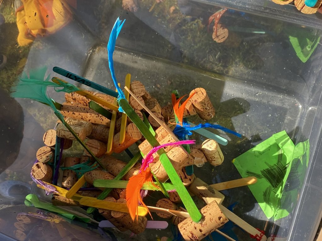 Im Anschluss wurde aus der Forschung Praxis: Aus den schwimmenden Materialien bauten die Kinder eigene kleine Boote. Dabei brachten sie viel Kreativität und Fantasie ein und setzten zugleich handwerkliche Fähigkeiten ein. Besonders spannend war es, die fertigen Boote anschließend im Bach des Britzer Gartens auszuprobieren. So konnten die Kinder ihre zuvor gesammelten Erkenntnisse direkt anwenden und ihre Konstruktionen in Aktion erleben.