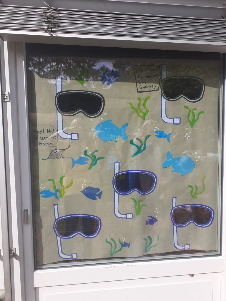 Ein besonderes Highlight war unser „Aquarium-Gruppenraum“: Die Fensterscheiben wurden mit blauer Folie abgedunkelt und mit kleinen „Gucklöchern“ in Taucherbrillenform versehen. Dahinter verbarg sich eine Projektion echter Unterwasseraufnahmen aus dem Roten Meer, gefilmt von einer unserer Erzieherinnen, die dort regelmäßig tauchen geht. Die Kinder konnten so in eine faszinierende Unterwasserwelt eintauchen – ganz ohne nass zu werden!