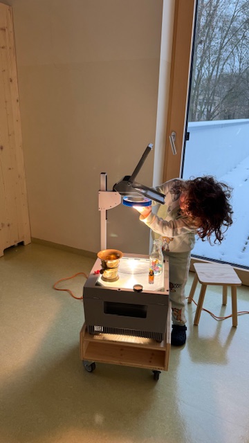 Im Forscherraum unseres Kindergartens Tischlerzeile gehen die Kinder diesen Fragen ganz praktisch nach. Dort steht ein Overheadprojektor, den sie im Rahmen eines kleinen Projekts kennenlernen und ausprobieren durften.