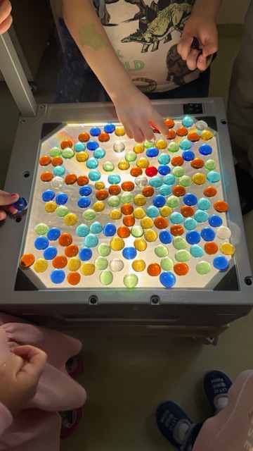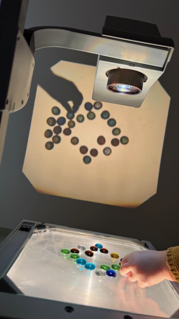 Mit großer Neugier erkundeten sie zunächst das Gerät: Wo kommt das Licht her? Warum wird es an die Wand projiziert? Schnell wurde ausprobiert, experimentiert und gestaunt. Besonders beliebt waren die Schattenspiele – mit den eigenen Händen entstanden Tiere und Fantasiefiguren, die in riesiger Größe an der Leinwand erschienen. Auch runde, bunte Glassteine kamen zum Einsatz: Auf die Projektionsfläche gelegt, verwandelten sie sich in leuchtende Farbkreise, die den Raum in ein kleines Lichtertheater tauchten.