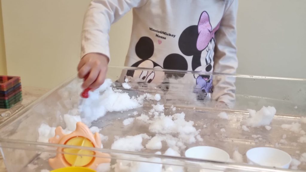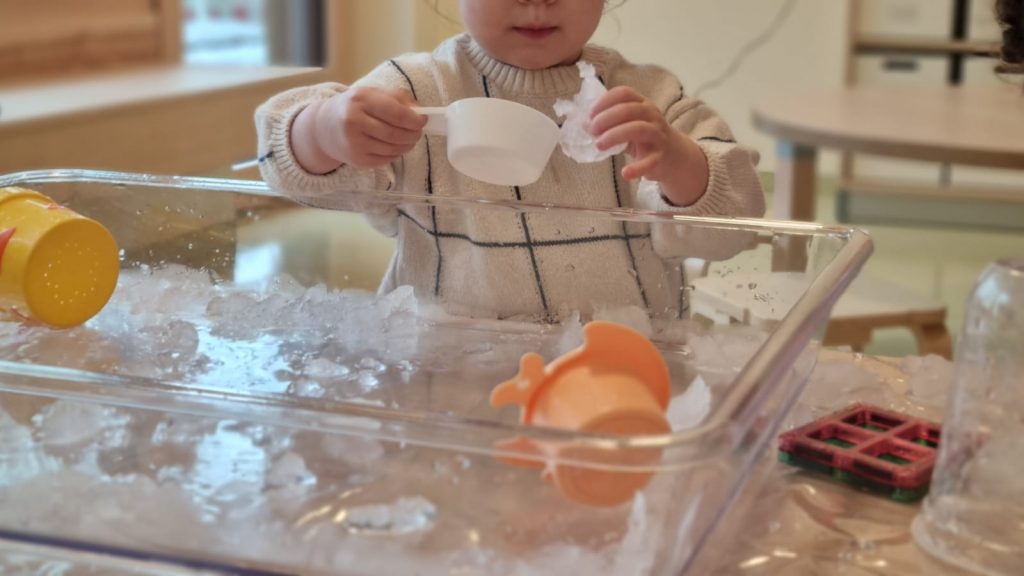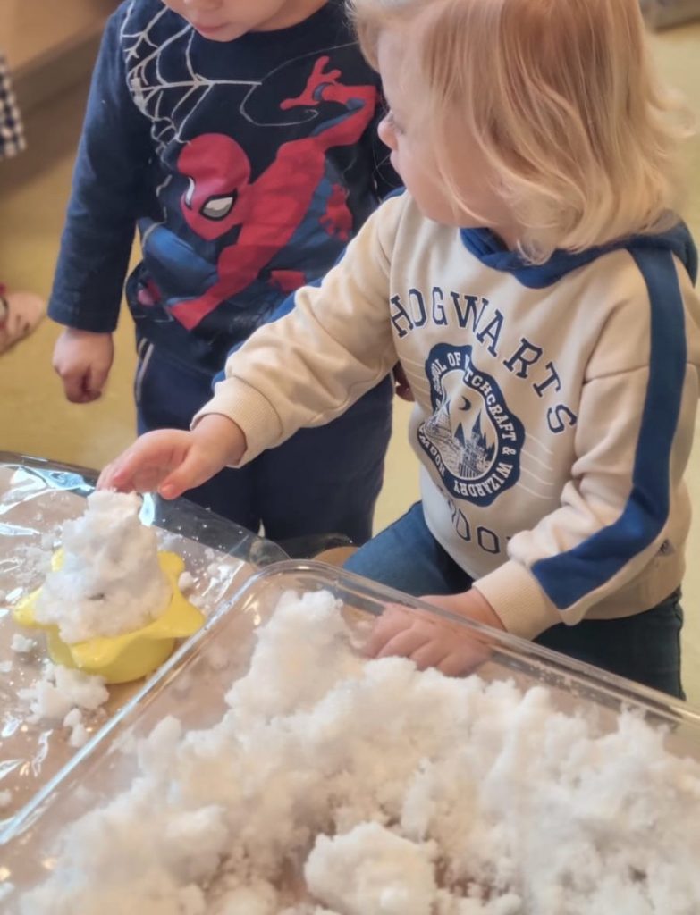 Da es für unsere Jüngsten draußen zu kalt war, brachten die Pädagoginnen den Schnee einfach ins Haus. In einer Wanne voller Schnee konnten die Kinder die ungewöhnliche Materialerfahrung hautnah erleben: sie fühlten die Kälte, formten Strukturen und beobachteten, wie der Schnee sich verändert.