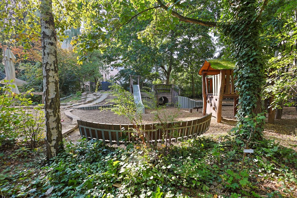 Im Außenbereich des Kindergartens bietet die naturnah gestaltete Spiellandschaft mit Hügel, Quellstein, Bachlauf, Tunnel, Rutsche, Kletterlabyrinth, Rollerweg und einem Barfußpfad viel Raum für entdeckungsfreudige Kinder. Die tägliche Arbeit des Kitateams ist geprägt von einem wertschätzenden Umgang miteinander und der Stärkung der Individualität jedes Einzelnen.