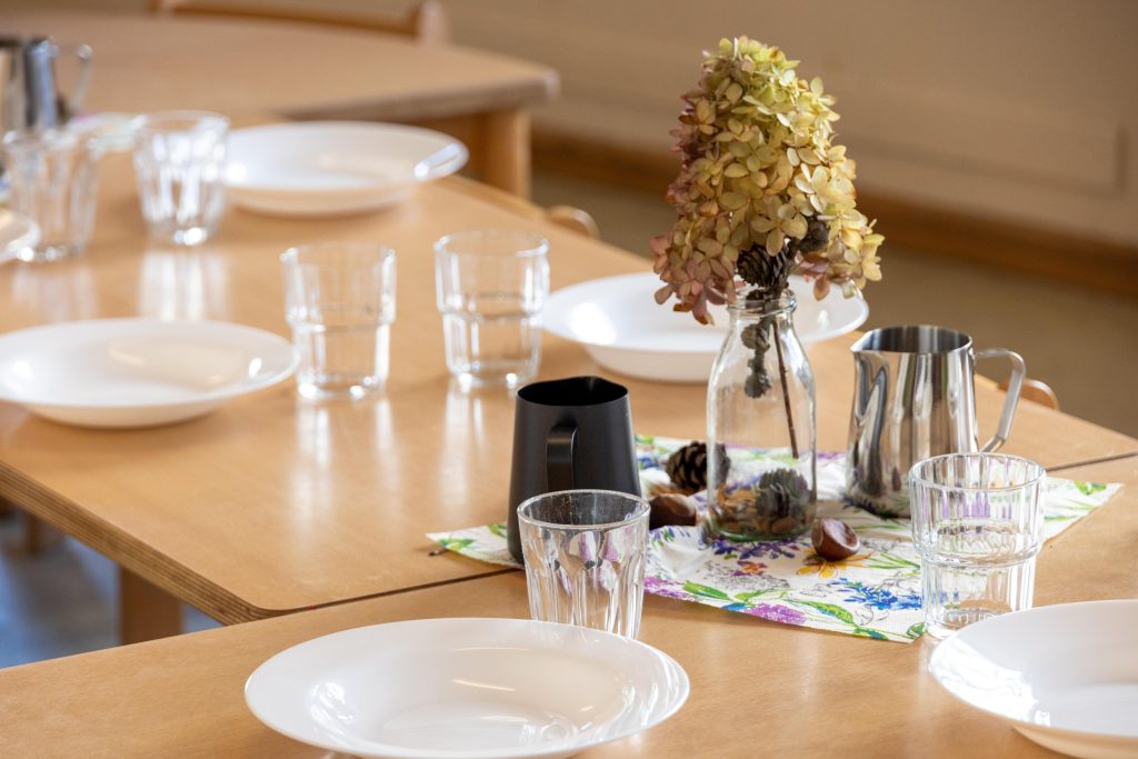 - Unsere Mahlzeiten sind kindgerecht abgestimmt: mit wenig Zucker und Salz, aber mit viel Geschmack und frischen Kräutern – oft aus den eigenen Kräuter- und Naschgärten.